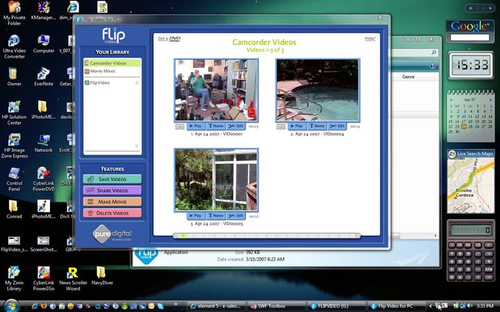 The real fun, though, begins when you connect the Flip Video to your PC or Mac. The idea here is that its on-board software installs itself and then runs automatically. In my testing, that worked fine on Windows XP, but the software revision on my eval unit still needed some tweaking to start automatically with Vista. On the Mac you need to run the software yourself, and there are fewer video editing functions. The picture below is a screen capture from a notebook with a 1280 x 800 pixel display, running Vista.
