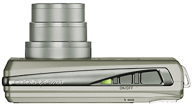 The front of the S700 is flat and very clean. Five little dots mark the microphone, the tiny flash and the AF-illuminator light sit along the top of the camera. The barrel itself is large, and the actual lens sits off-center. Nikon masked that with a black insert. The lens barrel itself is big and motors out a very significant distance when you turn the camera on (see above). There are lots of arguments pro and con internal folding zoom mechanisms. Personally, in a stylish camera like the S700, I'd have preferred a fully internal zoom.