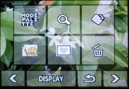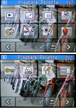 Th T30 lets you access 17 functions in playback mode. To access those, you tap the display. That first gets you into a top menu from where you can zoom, rotate, delete, add a frame (three are in the camera, more are downloadable for free), use digital ink to write or doodle on pictures, or enter the second level menus, called the "Playback Palette." From here you have access to a variety of filters, slide shows, the above mentioned voice annotation, red eye removal, resizing, movie edit, copying images between internal memory and storage card, setting an image as the startup picture, resize, crop, protect, and more. Playback zoom is up to 8X.