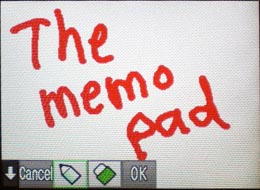 What would a touchscreen be without the ability to annotate or doodle? The Optio T30 offers that ability both on blank screens and on top of stored images. You can select the color, thichkness and brush type, and then draw or write onto your pictures. The ink doesn't move as quickly and smoothly as I'd like, but the feature can come in handy. You can also stamp little hearts and other glittery little things onto pictures. I am not so sure I need that, but it may come in handy when playing with kids.