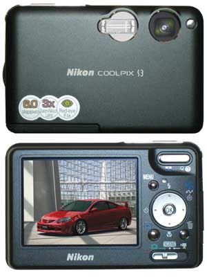 Of all the contestants in this thin-is-in lineup, the Pentax Optio S6 comes closest to the very high standard set by the Casio S500-- a camera that simply sticks out not only with its red body but also its incredibly thin futuristic design. The Optio, however, does it the old-fashioned way, without any of the visual tricks employed by the seductive Casio. The Pentax is is a conventionally styled metallic little box, the way we've come to expect ultra-compact cameras to be over the past several years. It uses the time-honored variety of shiny, brushed and matte metal finishes to make for a high-tech look that doesn't look so high tech anymore. And it strictly adheres to the "the boxier the better" school of design that has served digital camera manufacturers so well ever since the inital Canon Elphs.